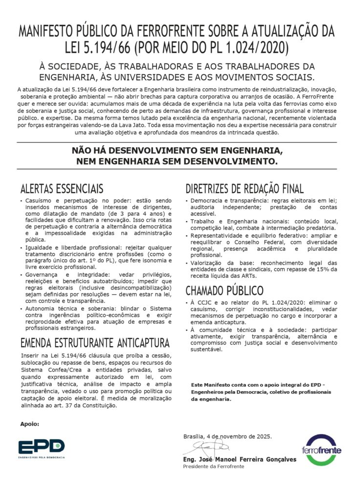 A FerroFrente, com o apoio integral do EPD – Engenheiros pela Democracia, preparou um manifesto público que será entregue aos deputados da CCJC durante a audiência pública de terça-feira, 04 de novembro, em Brasília.